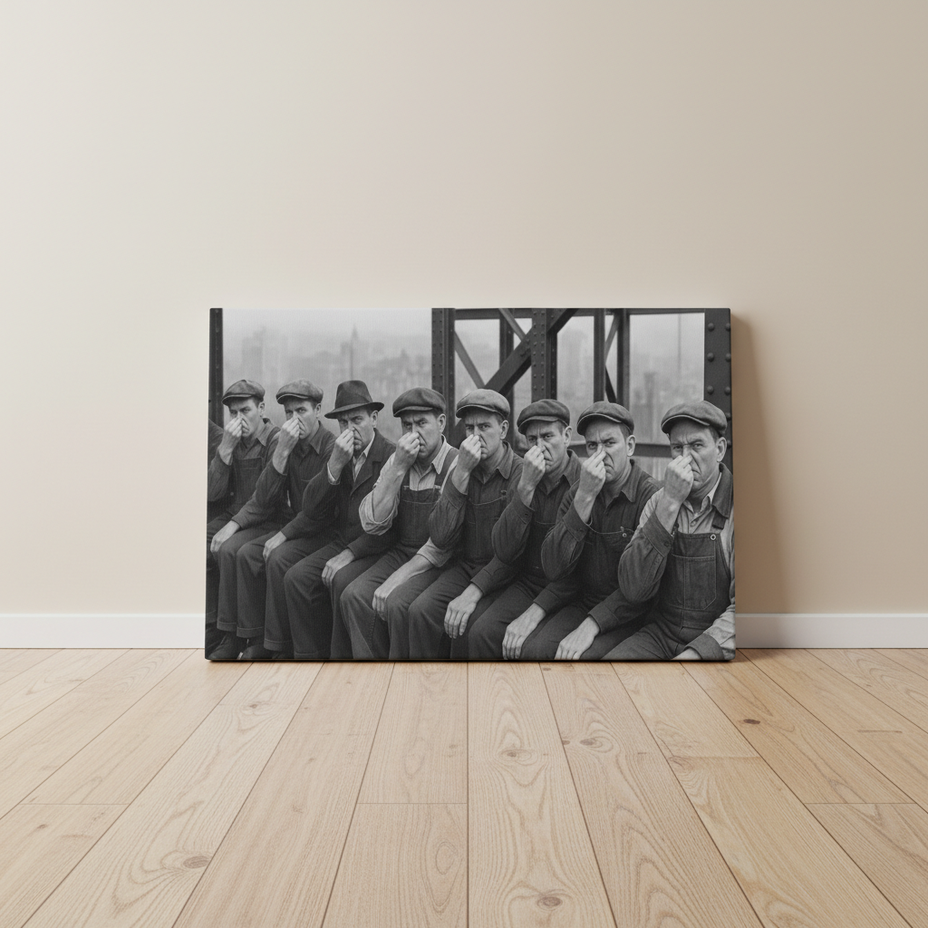 The famous “Lunch atop a Skyscraper” just took a turn for the stinky! This imaginative canvas wrap reimagines the classic 1930s photo of construction workers eating lunch on a high steel beam – only now, one of the guys opened a lunch that really smells. The whole row of hard-hats are turning away and holding their noses in cartoonish disgust, even 800 feet in the air. Printed on a quality canvas and stretched over a sturdy frame, this piece comes ready to hang (no safety harness required). Offered in 8×12, 12×18, or 16×24 inches. It’s a perfect blend of history and humor for your bathroom wall, sure to get guests laughing and maybe thinking twice about bringing tuna sandwiches to work.