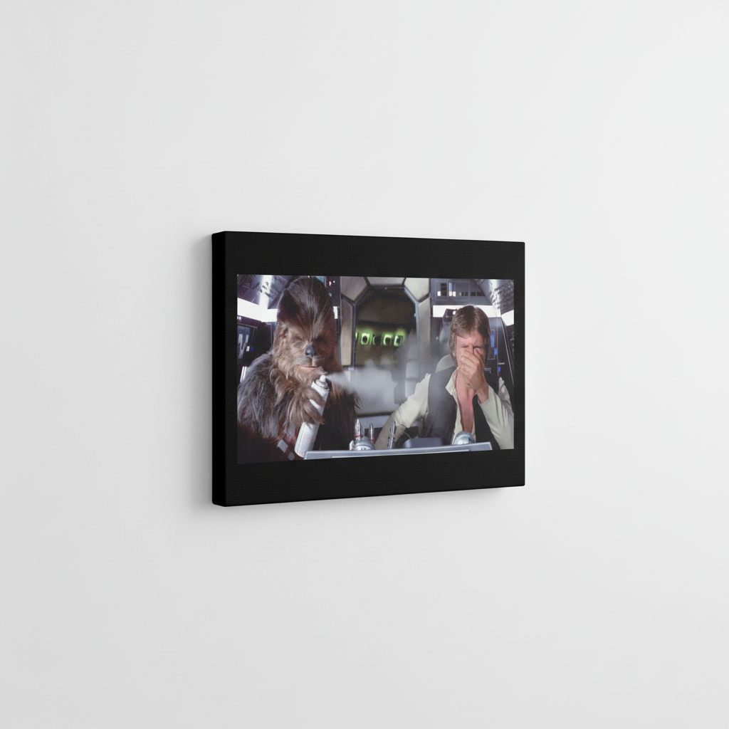 Chewie and his daring co-pilot have faced the Death Star, but nothing prepared them for the smell in here! The Chewbacca and Hans Stink Face Canvas Wrap showcases your favorite Wookiee-and-scoundrel duo side by side, both giving matching looks of pure disgust at your bathroom’s “atmosphere.” It’s side-splitting, funny bathroom art that turns an ordinary restroom into a conversation-starting rebel base. Fans will love this novelty canvas wrap printed in sharp detail on quality canvas and stretched over a sturdy frame – bringing a whole galaxy of humor to your walls. Available in 8×12, 12×18, and 16×24 inches, this hilarious wall decor for bathrooms makes sure the Force is strong with anyone who enters (or at least gives them a good laugh on the way out).