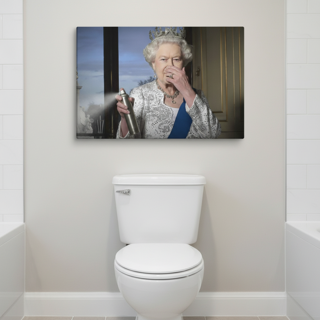 Her Majesty the Queen was known for her poise – and apparently for her preparedness when it comes to foul odors! The Queen Elizabeth Air Freshener Canvas Wrap captures a humorous scene of Queen Elizabeth II elegantly handling a stinky situation with a can of air freshener in hand. This novelty canvas wrap adds a touch of royal wit to your collection of funny bathroom art, delighting guests with the idea that even the Queen isn’t above freshening up the throne room. Printed on high-quality canvas and stretched on a solid frame, it’s ready to hang and rule over your bathroom decor with ease. Available in 8×12, 12×18, and 16×24 inches, this hilarious wall decor for bathrooms is a real crown jewel of potty humor – a perfect mix of class and comedy.