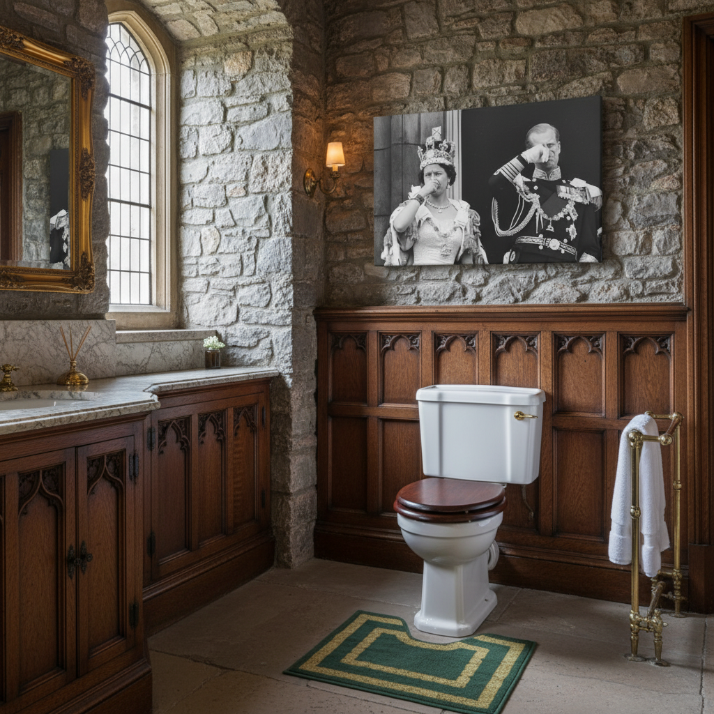 Even on the happiest of days, Her Majesty could still smell trouble! The Queen Elizabeth Wedding Stink Face Canvas Wrap features Queen Elizabeth II giving a hilariously disapproving look – perhaps at an unfortunate odor wafting through the royal reception. This piece combines royal elegance with bathroom humor, making it a standout piece of funny bathroom art that will catch everyone’s eye (and nose) in your powder room. It’s a novelty canvas wrap printed on premium canvas, hand-wrapped on a durable frame, and it comes ready to hang, so you can instantly add a touch of regal comedy to your wall. Offered in 8×12, 12×18, and 16×24 inches, it’s truly hilarious wall decor for bathrooms and a perfect conversation starter – after all, if the Queen can pull a stink face, so can we!