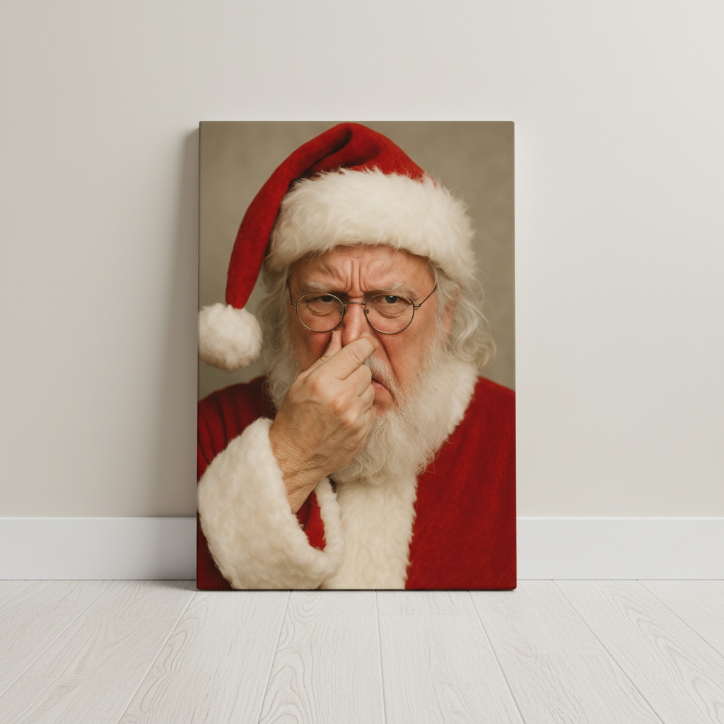 Santa's having a moment—and it's not a merry one. This hilarious canvas wrap captures jolly old St. Nick in full stink face mode, nose pinched and expression absolutely disgusted. Perfect for adding a cheeky laugh to any room, this comedic take on holiday décor proves that even Santa has his limits. Printed on quality canvas, it's available in three sizes to fit your space: 16 x 24 inches, 12 x 18 inches, or 8 x 12 inches. A playful gift for anyone who appreciates humor with their holiday spirit.